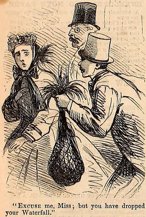 "Excuse me, Miss, but you have dropped your Waterfall." From Harper's Weekly, 1865.
