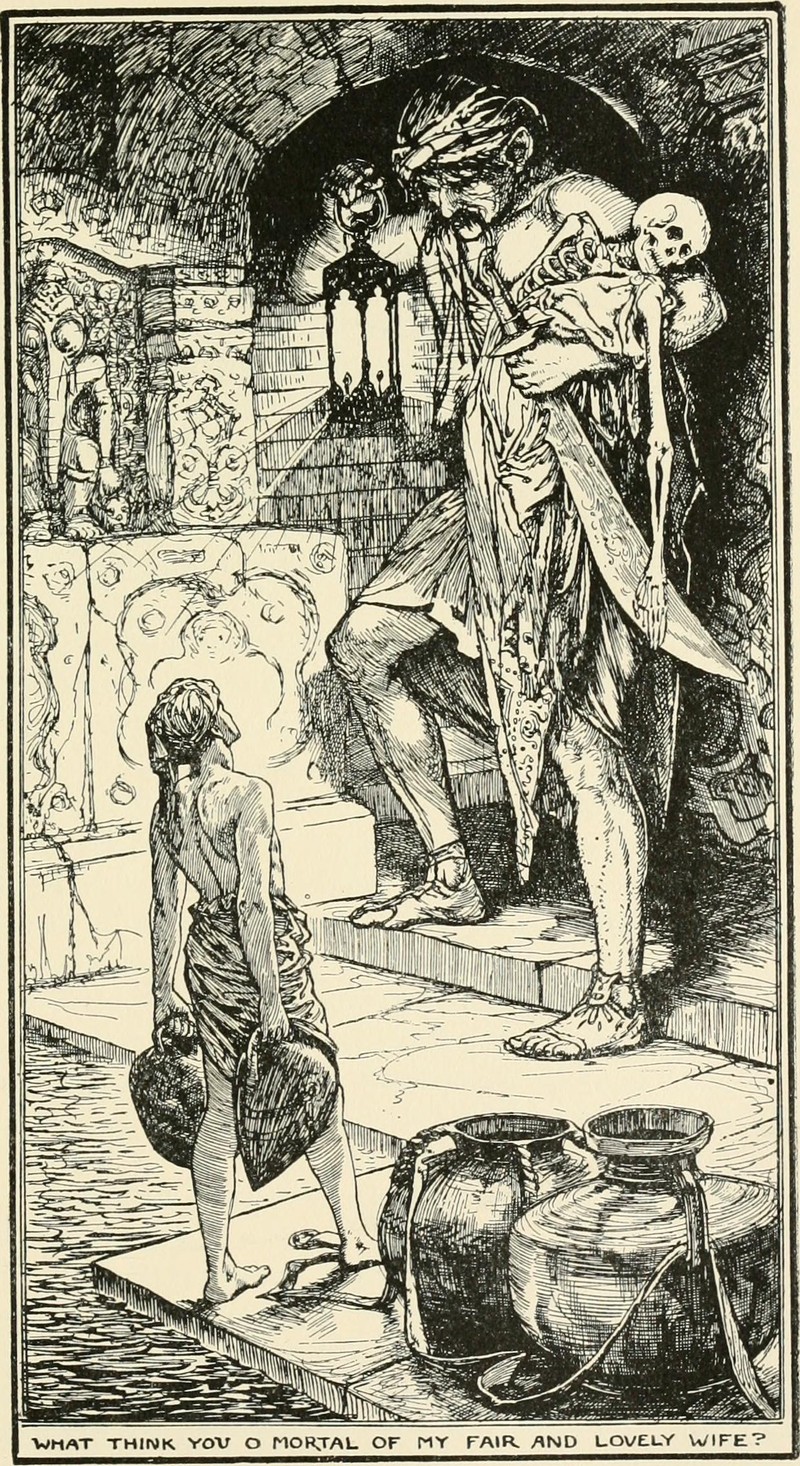 "What think you o mortal of my fair and lovely wife?" From The Olive Fairy Book by Andrew Lang, 1907.