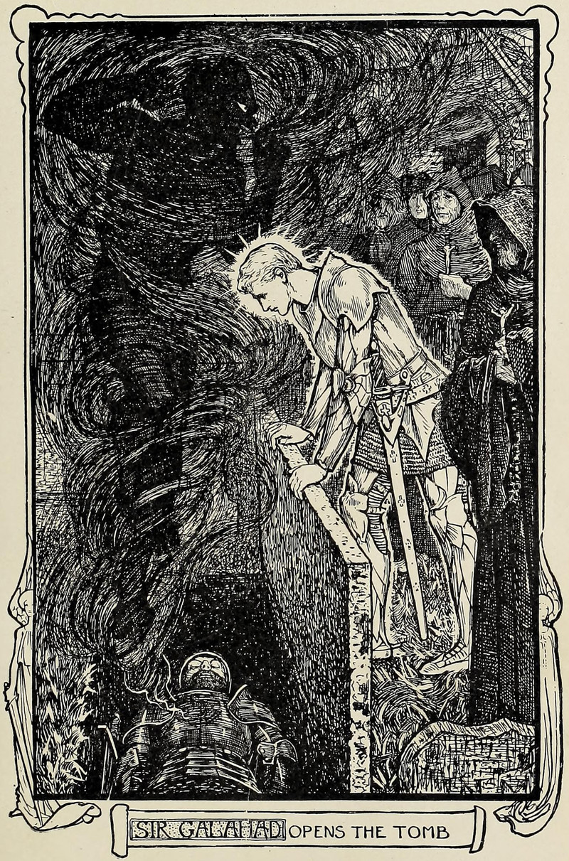 Sir Galahad opens the tomb.  From The Book of Romance by Andrew Lang, 1902.
