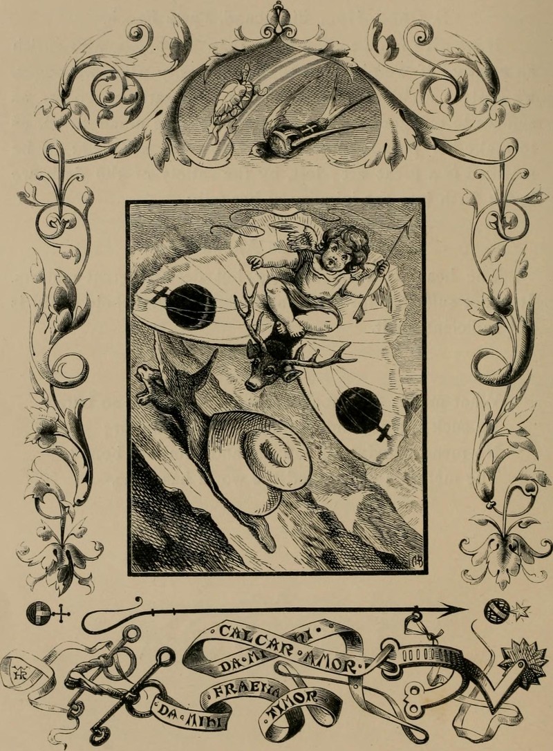 This is the best deer-headed moth flying over a donkey snail that we've seen all week. From Quarles' Emblems, 1861.