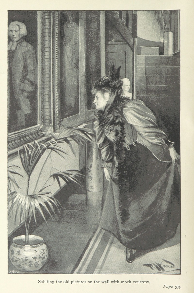 "Saluting old pictures on the wall with mock courtesy," from When the Birds Begin to Sing by Winifred Graham, 1897.