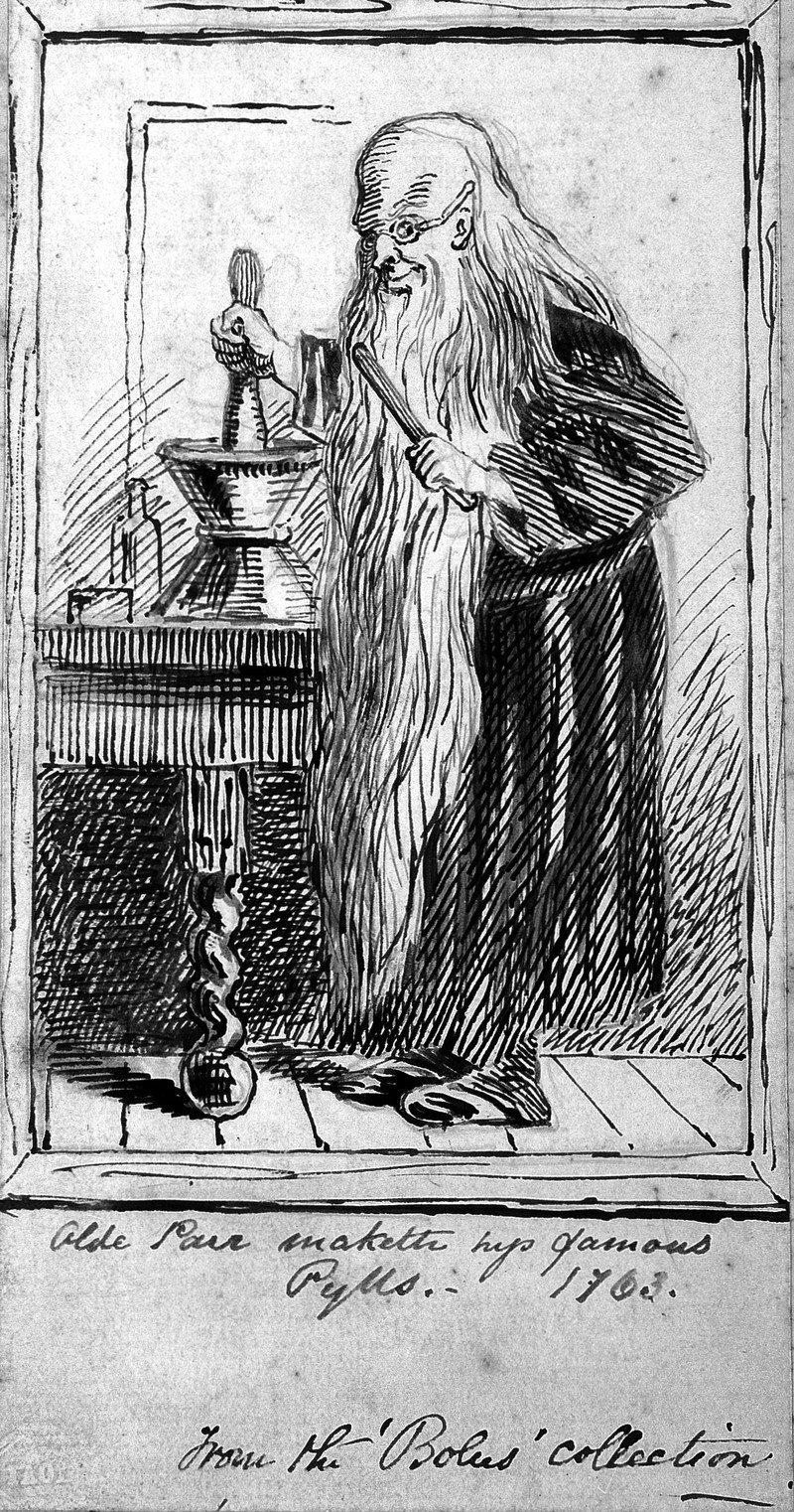 Here's a pen drawing of Old Parr, an apothecary with an extremely long beard, mixing his famous concoction with a pestle and mortar. Scanned by the Wellcome Library, London.