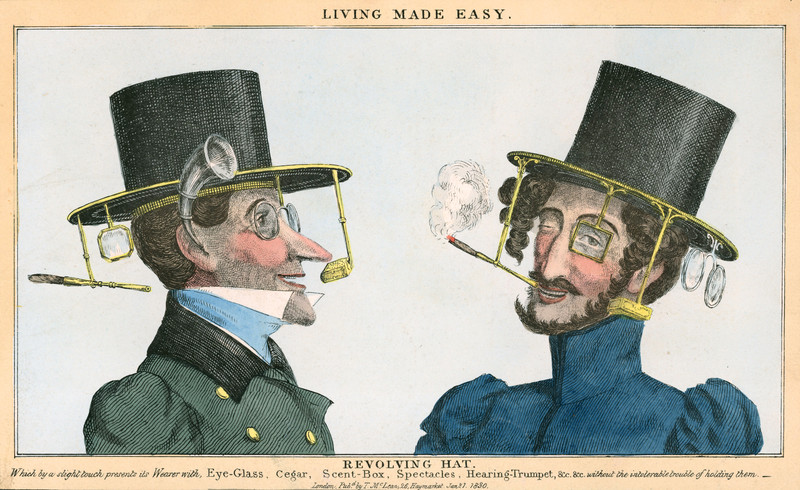 Living made easy with a revolving hat with eye-glass, cigar, scent box, spectacles and hearing trumpet, from 1830.