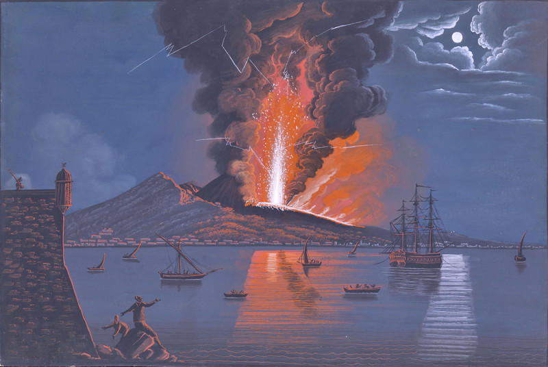 Gouache painting of Mount Vesuvius erupting over the bay of Naples, 18th century.