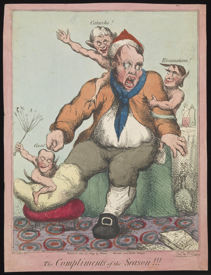 Gout, rheumatism and catarrh represented as three tormenting devils. Coloured etching by J. Cawse, 1809, after G.M. Woodward. This should also be of interest:How to Believe in Your Elf.