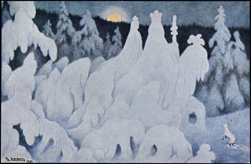 #vintage illustration #winter #rabbit #norway #midnight sun #1920s #snowscape #snow creatures #snow covered #illustration