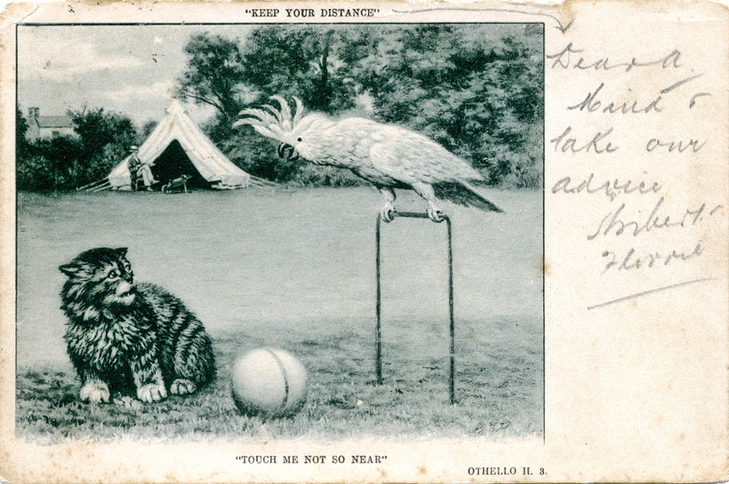 #vintage illustration #cat #shakespeare #cockatoo #vintage postcard #croquet #leave me alone #keep your distance #illustration #postcard