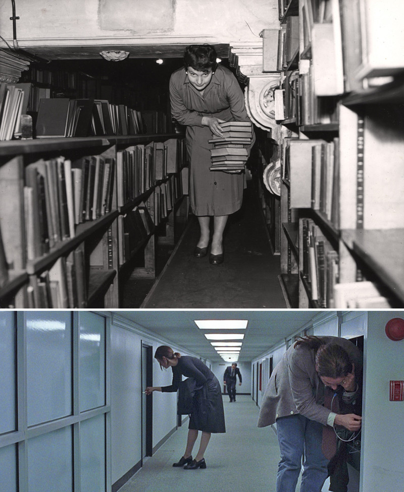 Here's a precursor to Floor 7½ in the film Being John Malkovich (bottom).  It's the Central Library, Newcastle upon Tyne, 1956 (top).