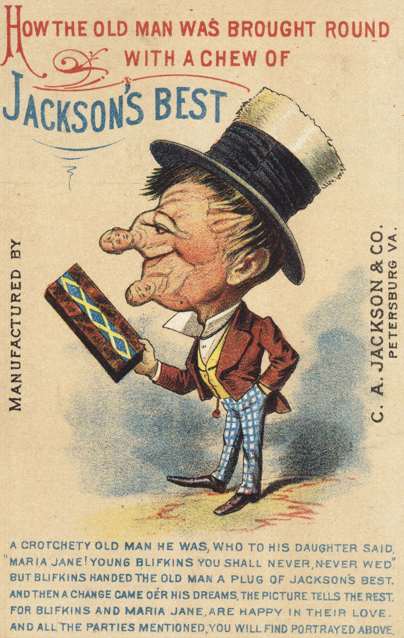 Do you detect a coded meaning to this ad from the turn of the century?  Though early for the use of "Mary Jane" as slang for marijuana, the "Maria Jane" reference here is paired with the unusual name "Blifkins" ("bliff" rhyming with "spliff," suggesting a cigarette of cannabis and tobacco), in the psychedelic context of "a change [coming] o'er his dreams."  When we include the hallucinatory portrait in which two figures emerge from the man's face, the ad seems to be suggesting that this particular tobacco combines happily with cannabis.