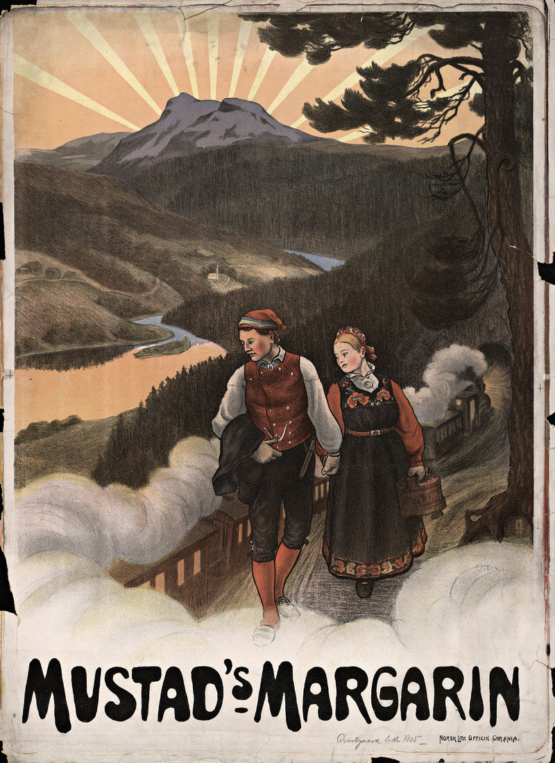If you love your margarine like you love being enveloped by steam from a train on a Norwegian fjord at dawn with your loved one, then Mustad's Margarin is apparently for you. By Othar Holmboe, 1905. Scanned by the Nasjonalbiblioteket
