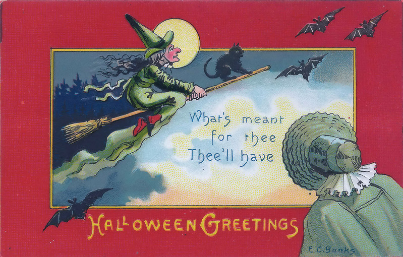 #witch #broomstick #black cat #october #bats #vintage halloween #vintage postcard #halloween postcard #postcard