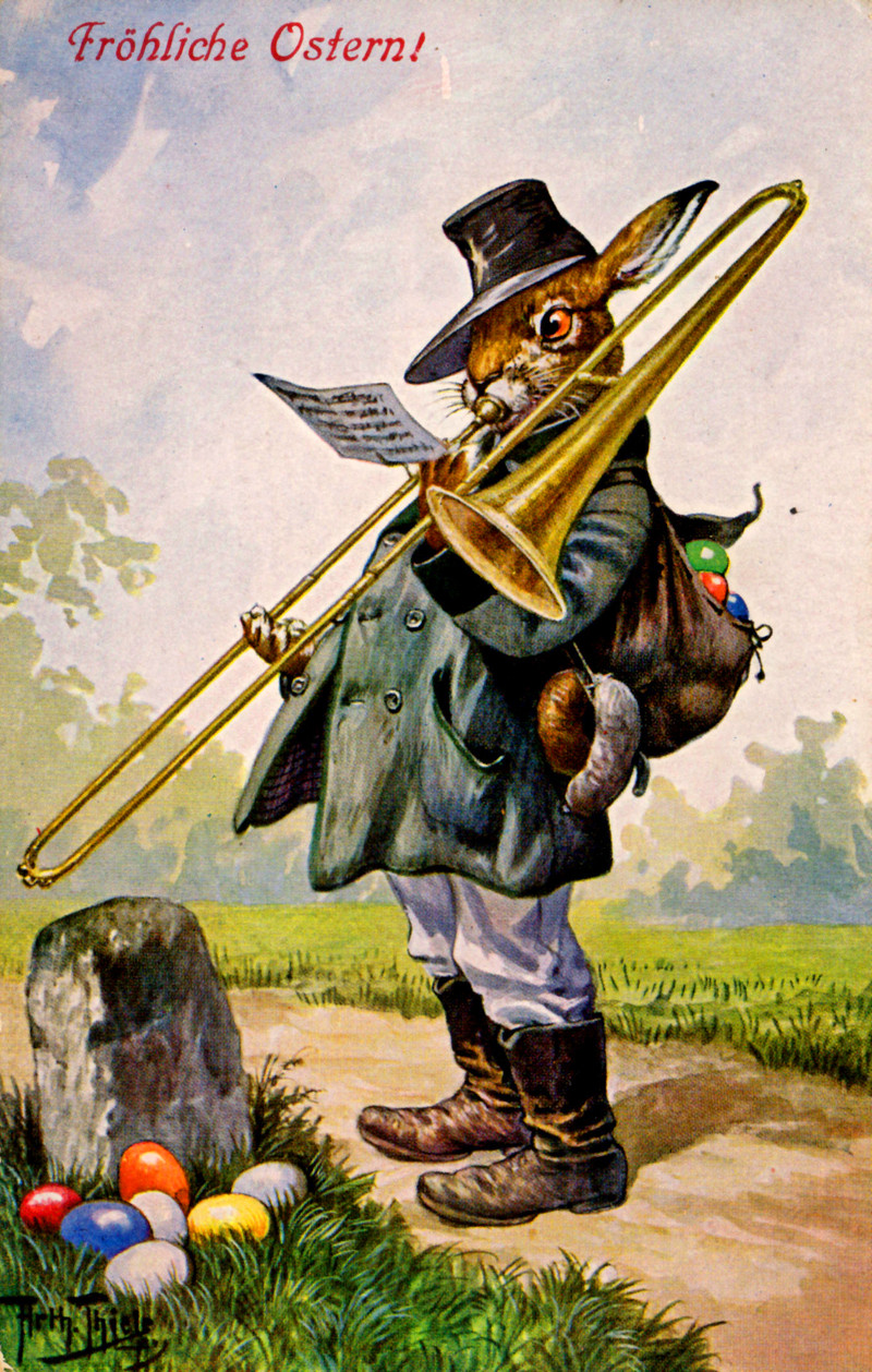 #anthropomorphism #easter bunny #bunny #musical animal #vintage postcard #easter eggs #postcard