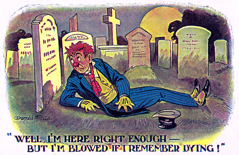"Well, I'm here right enough — but I'm blowed if I remember dying!"  A postcard by Donald McGill.  Date unknown.