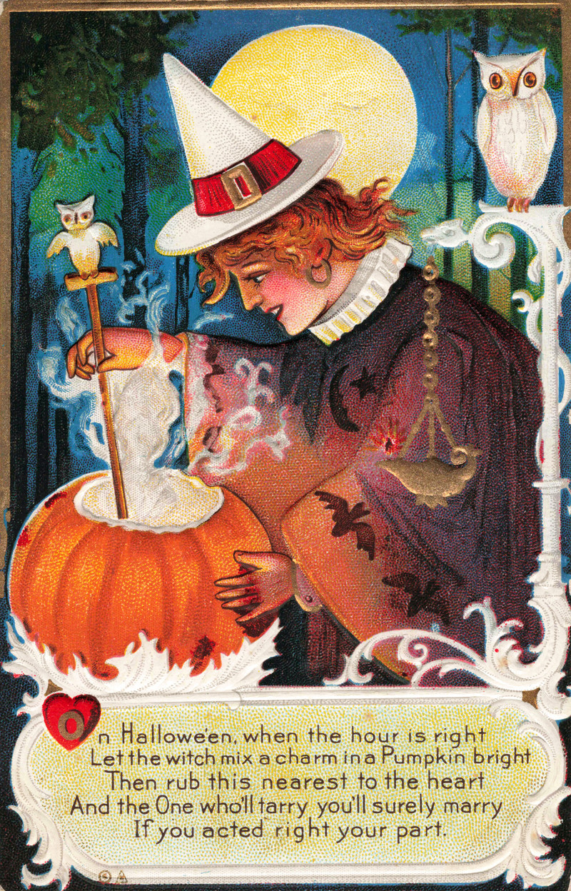 "On Hallowe'en, when the hour is right, let the witch mix a charm in a pumpkin bright."  Date uncertain.  Via UpNorthMemories.