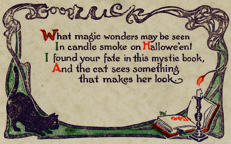 "What magic wonders may be seen in candle smoke on Hallowe'en! I found your fate in this mystic book, and the cat sees something that makes her look." Date uncertain.