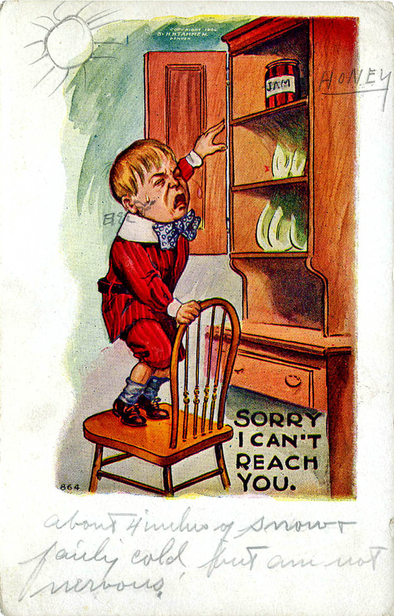 The handwriting reads, "About 4 inches of snow & fairly cold but am not nervous." Note that a sun has been penciled into the corner of the room, and the jam has been transmogrified into honey. From 1909.