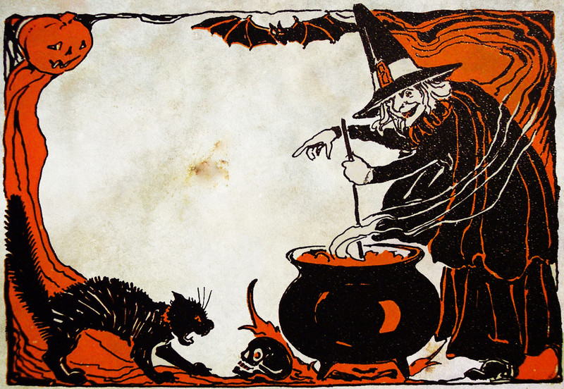 #vintage illustration #witch #halloween #black cat #cauldron #october #hallowe'en #vintage postcard #halloween postcard #vintage hallowe'en #illustration #postcard