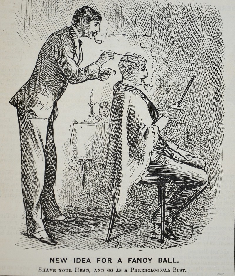 Here's a precursor to performance artist Leigh Bowery.  "New idea for a fancy ball.  Shave your head, and go as a phrenological bust."  From Punch, 1878.