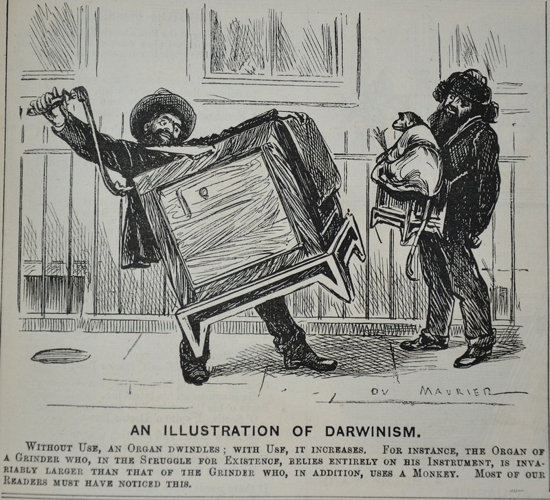 Here's George du Maurier's illustration of Darwinism from Punch, 1878. "Without use, an organ dwindles; with use it increases. For instance, the organ of a grinder who, in the struggle for existence, relies entirely on his instrument, is invariably larger than that of the grinder who, in addition uses a monkey. Most of our readers must have noticed this."