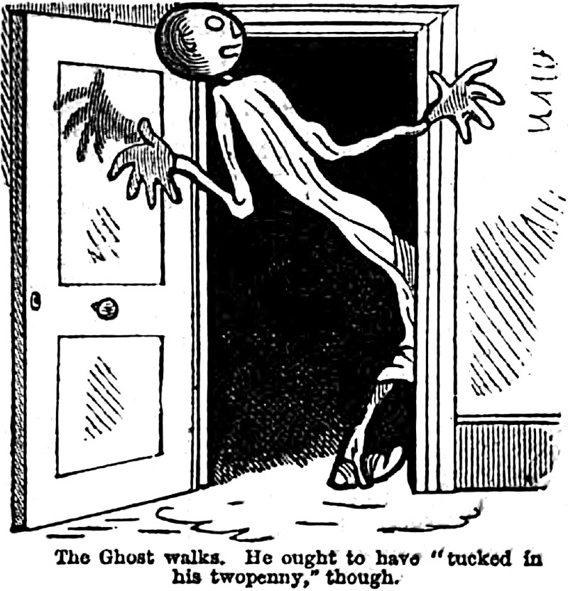 "The Ghost walks.  He ought to have 'tucked in his twopenny,' though."  From Judy, Or The London Serio-Comic Journal, 1873.