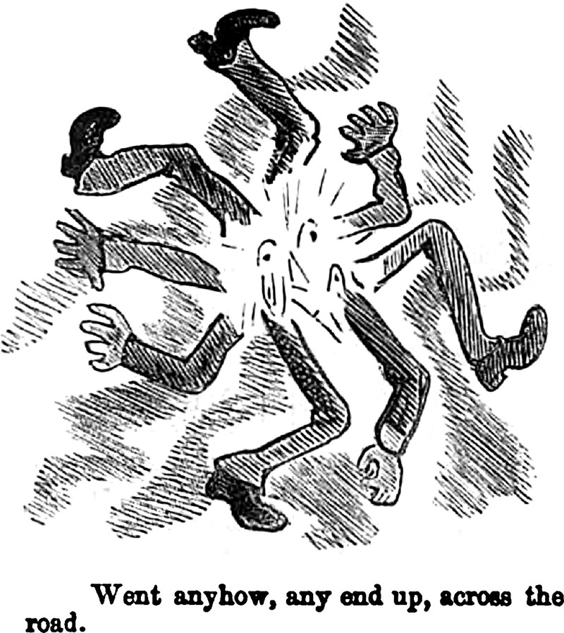 "Went anyhow, any end up, across the road."  From Judy, Or The London Serio-Comic Journal, 1879.