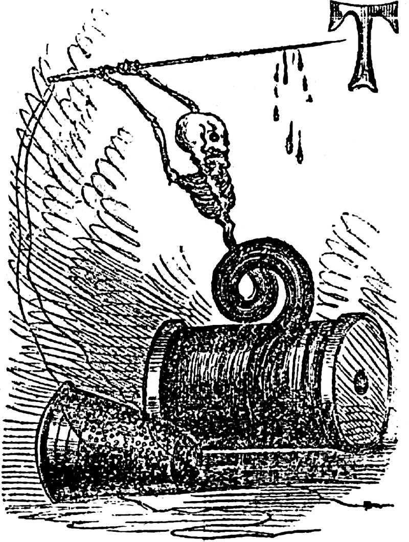 Here's a skeleton whose bottom half is made of thread, stabbing a capital T with a needle.  From an 1863 issue of Fun magazine.