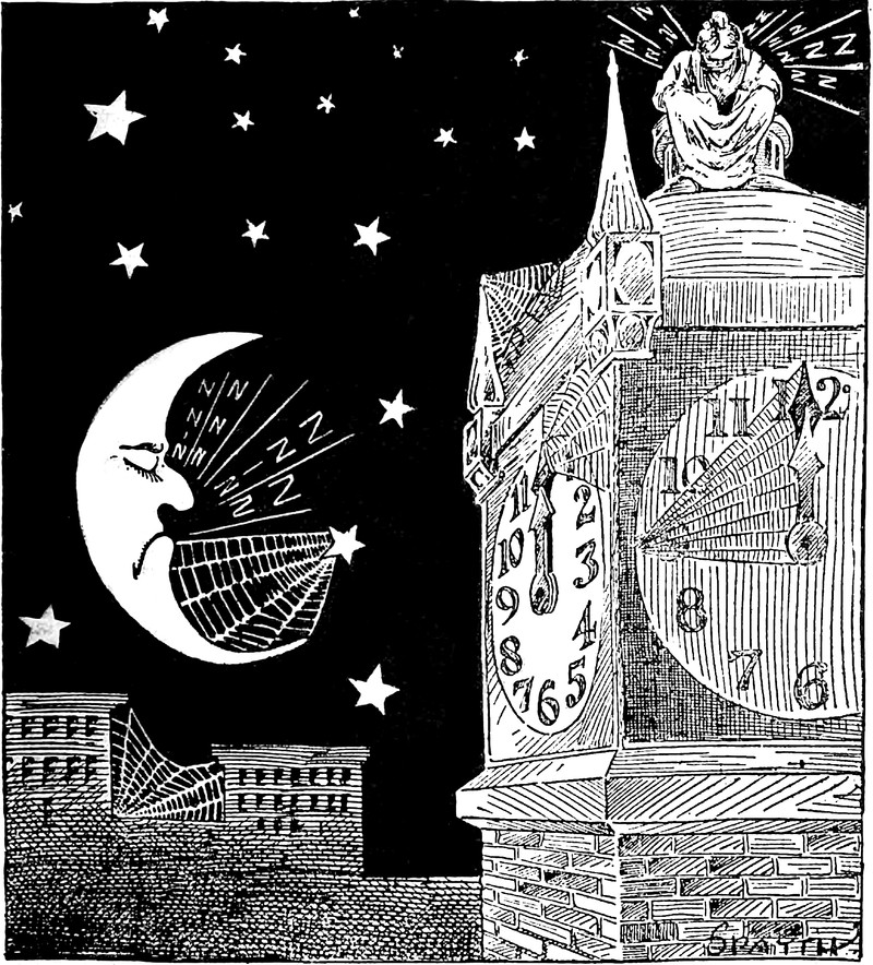 #vintage illustration #moon #crescent moon #starry night #clock #night #1920s #clock tower #time stopped #cobwebs #illustration
