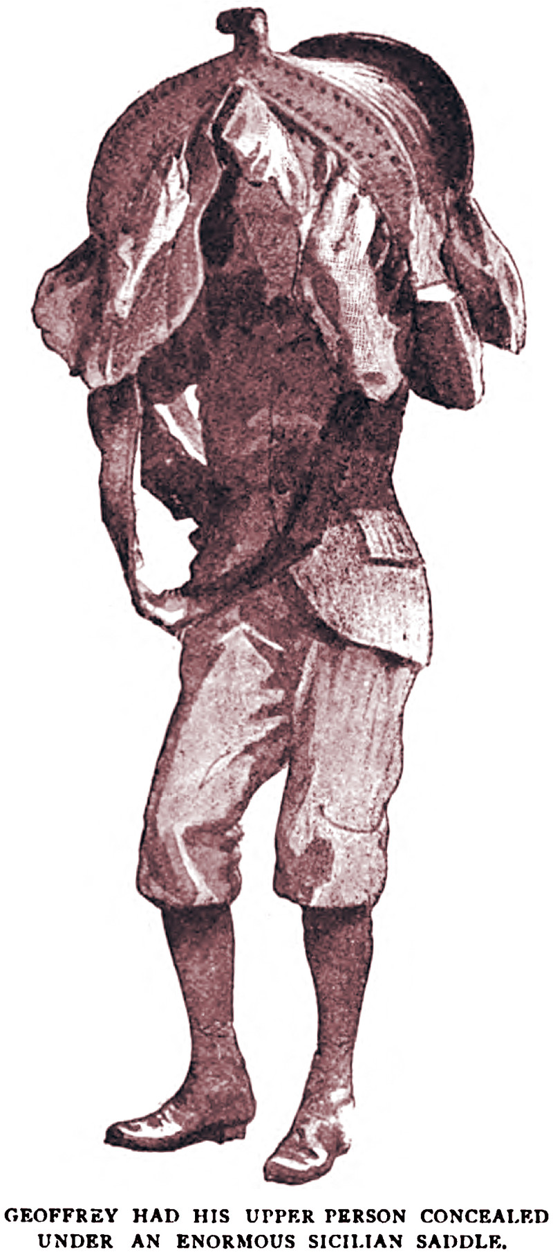 "Geoffrey had his upper person concealed under an enormous Sicilian saddle."  From English Illustrated, 1895.