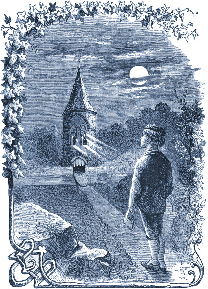 Is that the light of a second moon within the tower?  From Johnnykin and the Goblins, written and illustrated by Charles Leland, 1877.