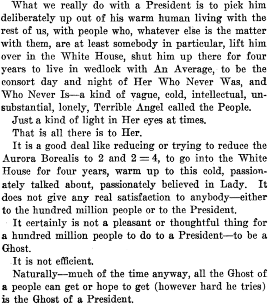 The true First Lady is "An Average," also known as "Her Who Never Was and Who Never Is," "a kind of vague, cold, intellectual, unsubstantial, lonely, Terrible Angel called the People."  All there is to her is "a kind of light in Her eyes at times."  The relationship is unsatisfying to both the President and the First Lady, much like trying to reduce the Aurora Borealis to a simple mathematical equation.  All this we learn in The Ghost in the White House: Some Suggestions as to How a Hundred Million People (Who are Supposed in a Vague, Helpless Way to Haunt the White House) Can Make Themselves Felt with a President, How They Can Back Him Up, Express Themselves to Him, be Expressed by Him, and Get What They Want by Gerald Stanley Lee, 1920.