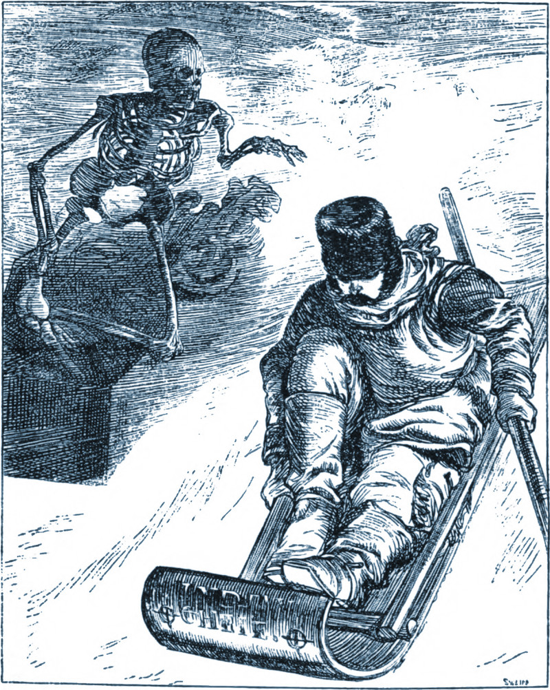 #vintage illustration #death #skeleton #grim reaper #sledding #illustration