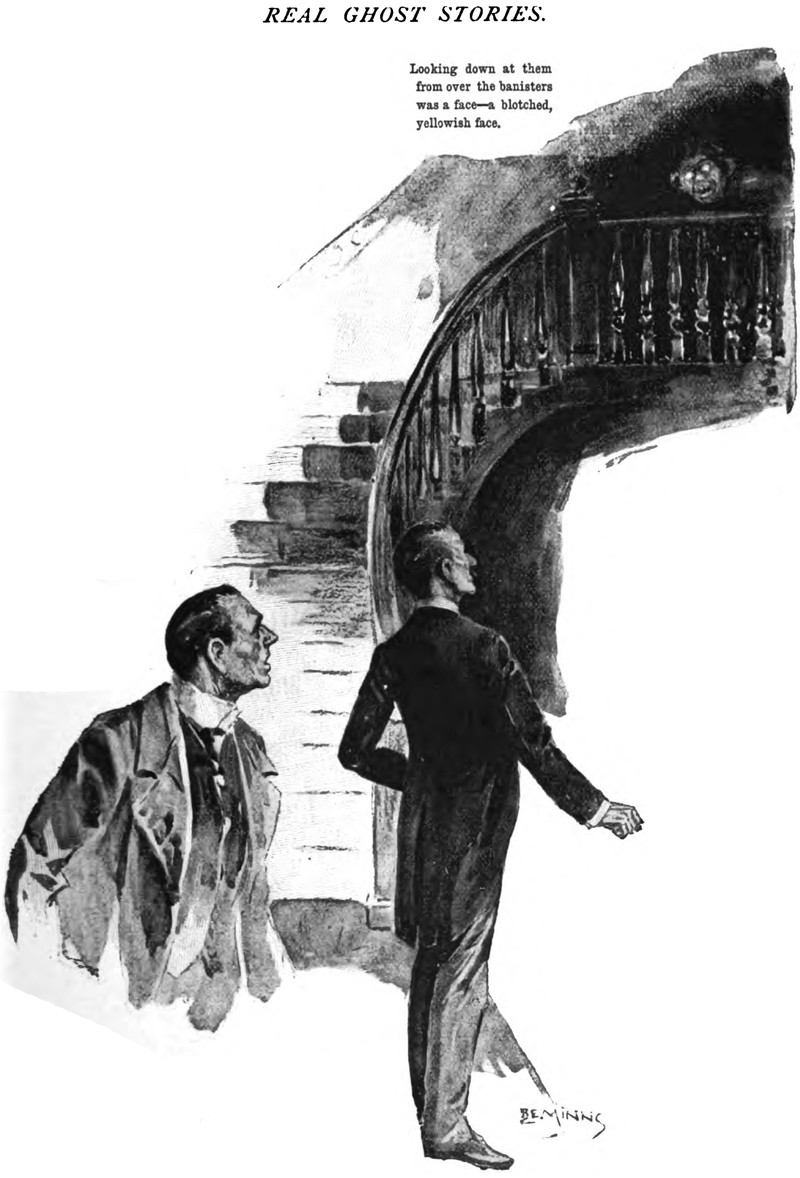 "Looking down at them from over the banisters was a face—a blotched, yellowish face."  From "Real Ghost Stories" in Pearson's, 1898.
