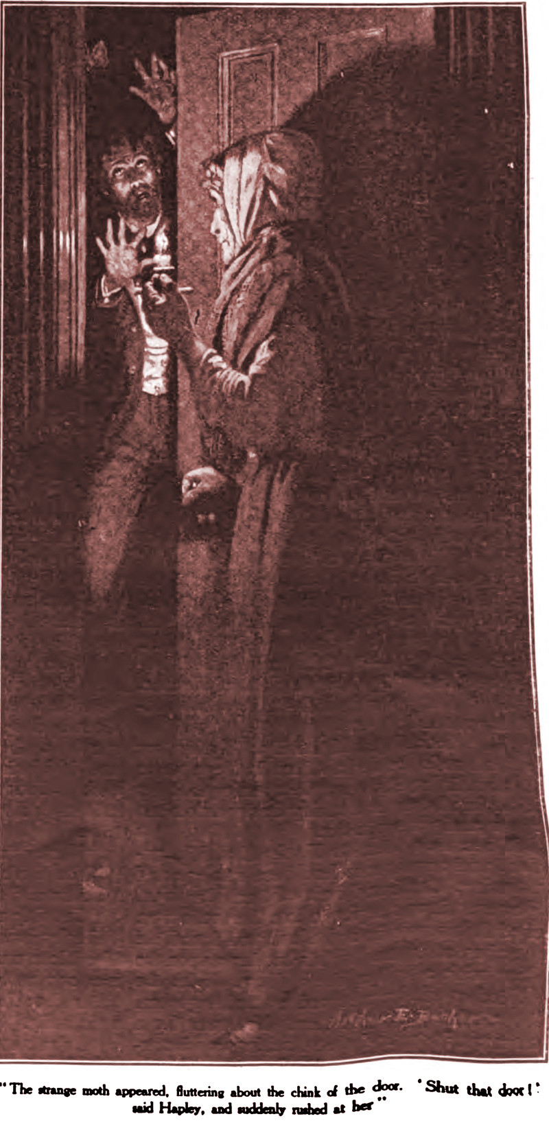 "The strange moth appeared, fluttering about the chink of the door.  'Shut that door!' said Hapley, and suddenly rushed at her."  From Pearson's, 1905.