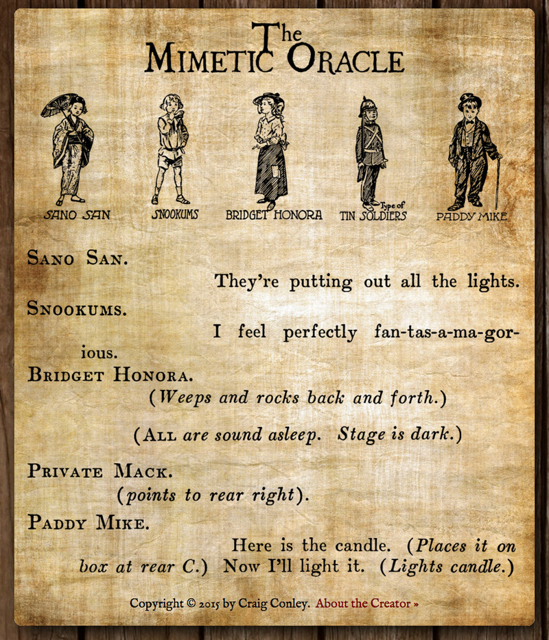 Due to our mysteriously esoteric studies, we're often asked for oracular predictions about the new year. For the upcoming transition, we consulted our own Mimetic Oracle, and here's why: life is a grand pageant, and it's been said that theatre reveals what is behind so-called reality. Our Mimetic Oracle draws from 92 characters in six vintage plays, with 166 spoken lines and 31 stage directions in the mix. With the system, one randomly draws five characters and generates a script to illuminate the current drama of life. (There’s a detailed F.A.Q. which explains how the scripts are created, how to make sense of the dialogues, how to determine whether a reading is positive or negative, what to make of the various characters, and why these specific 6 plays were chosen for the system: http://www.mysteryarts.com/play/.)