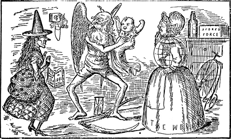 The witch on the left is dropping her book prophesizing the end of the world in 1881, as Father Time presents Baby New Year 1882 and The World looks on. From Grip, 1882.