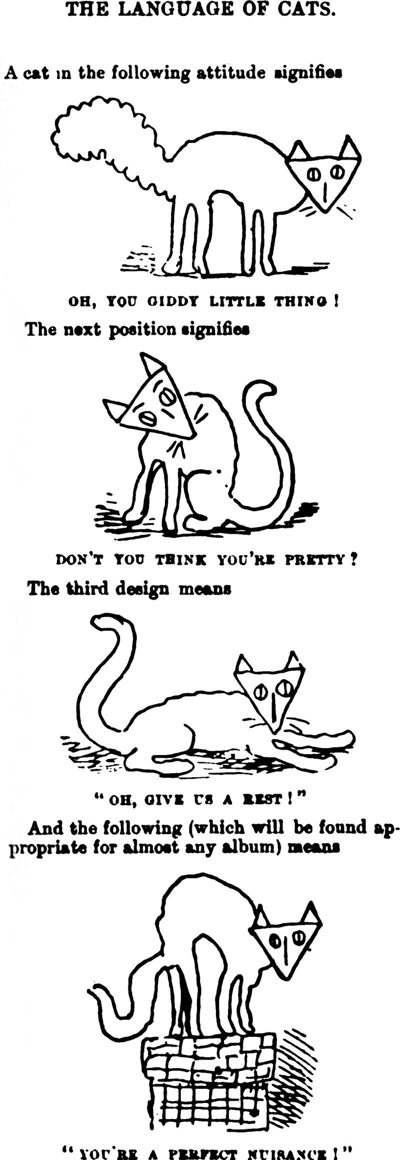 "The language of cats," from Grip, 1883.  This should also be of interest: How to Be Your Own Cat.