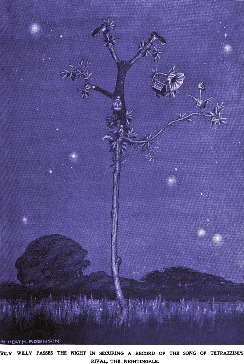 "Wily Willy passes the night in securing a record of the song of Tetrazzini's rival, the nightingale."  From The Sketch, 1908.