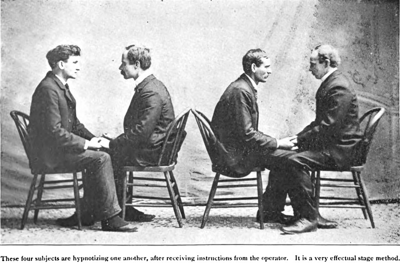 Hypnotizing one another, from Suggestive Therapeutics and Hypnotism by Herbert A. Parkyn, 1900.