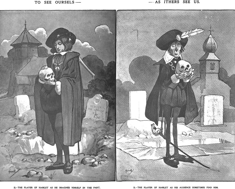 "To see oursels as ithers see us. II. The player of Hamlet as he imagines himself in the part. II. The player of Hamlet as his audience sometimes find him." [Parts one and two are both labeled with the Roman numeral II.] From The Sketch, 1905.