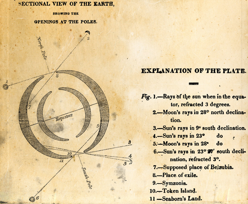 "Sectional view of the earth, showing the openings at the poles."  From Symzonia: A Voyage of Discovery by John Cleves Symmes, 1820.