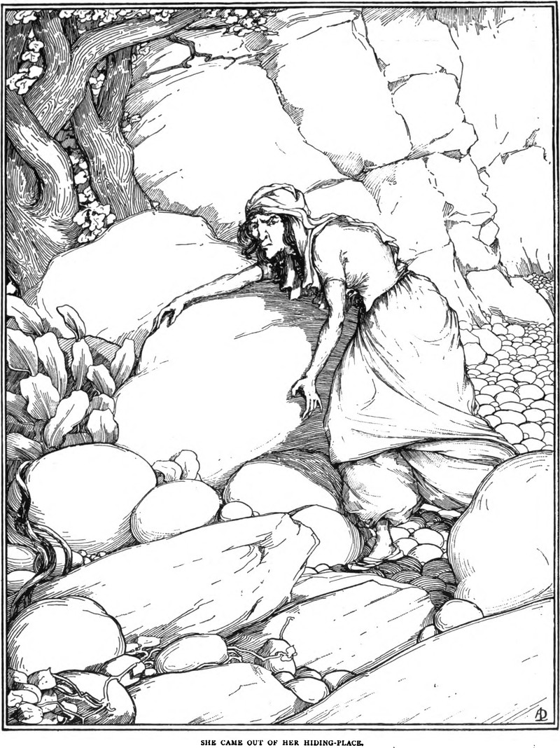 "She came out of her hiding place."  From The Arabian Nights Entertainments, 1899.