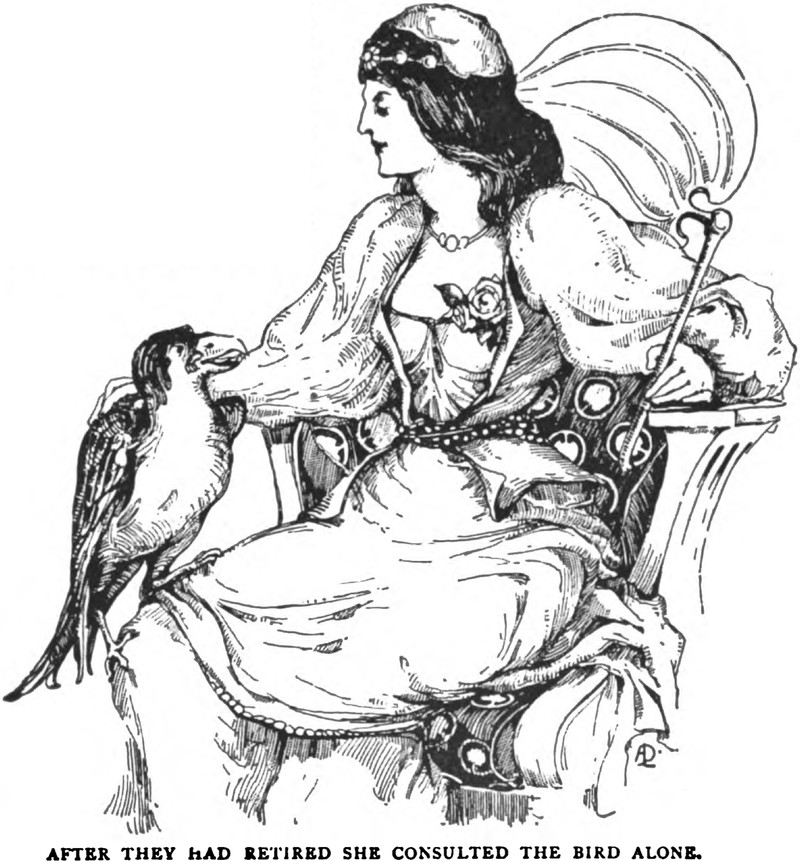 "After they had retired she consulted the bird alone."  From The Arabian Nights Entertainments, 1899.