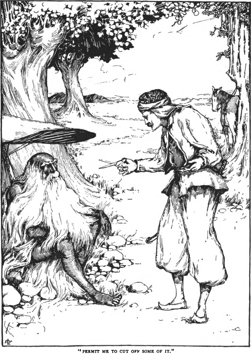 "Permit me to cut off some of it."  From The Arabian Nights Entertainments, 1899.