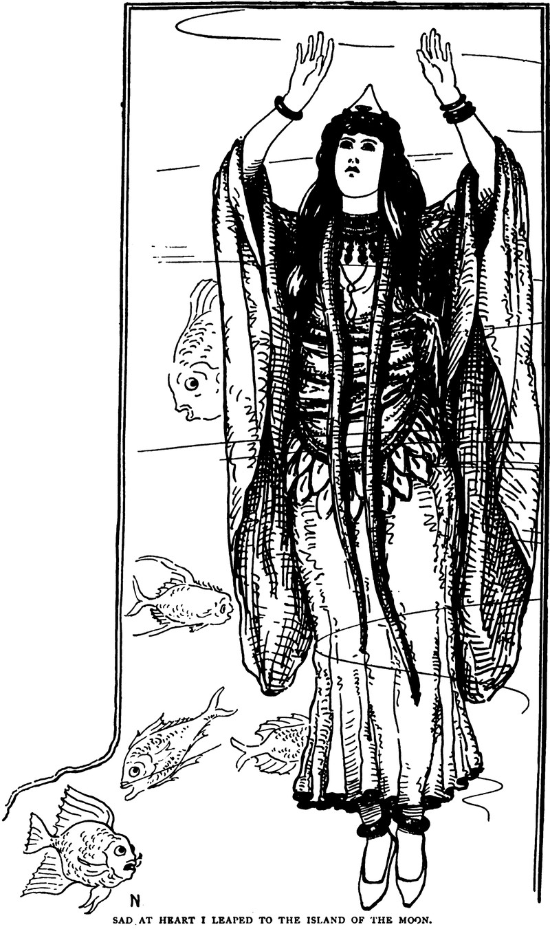 "Sad at heart I leaped to the island of the moon."  From The Arabian Nights Entertainments, 1899.