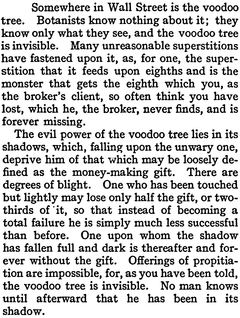 You've heard that money doesn't grow on trees. We learn the surprising reason why in Where the Money Grows by Garet Garrett, 1911. On Wall Street there is a "hoodoo tree" whose evil shadow deprives one of the money-making gift.