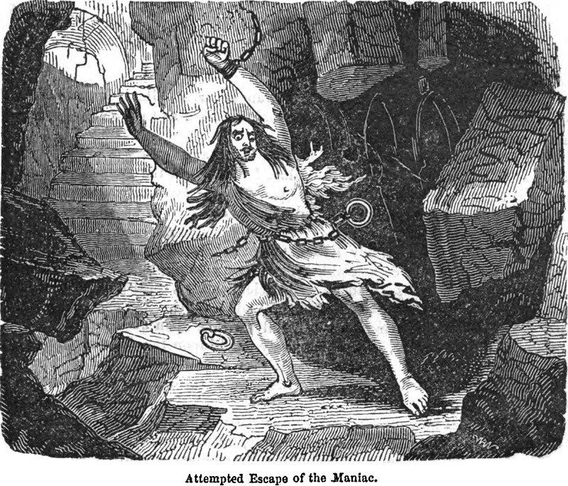"Attempted escape of the maniac."  From The Wild Witch of the Heath, or the Demon of the Glen by Wizard, 1841.