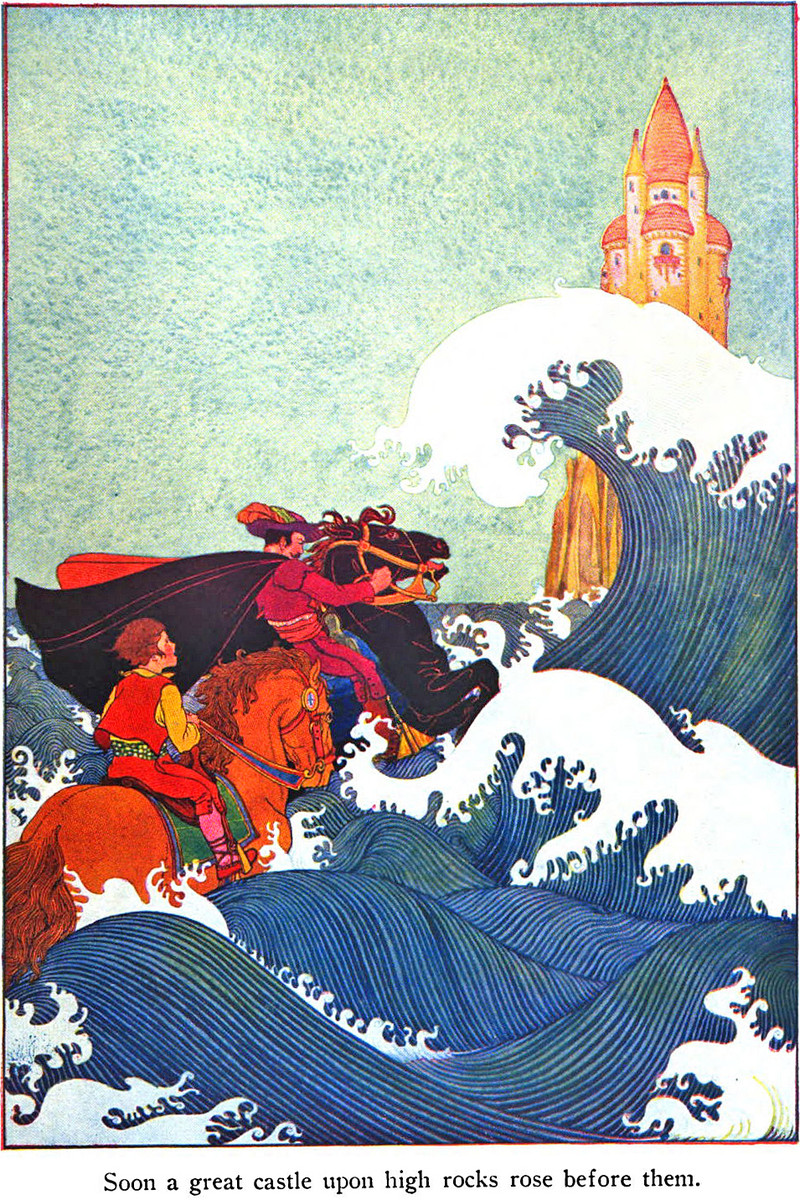 "Soon a great castle upon high rocks rose before them."  From Tales of Enchantment, illustrated by Maud and Miska Petersham, 1920.