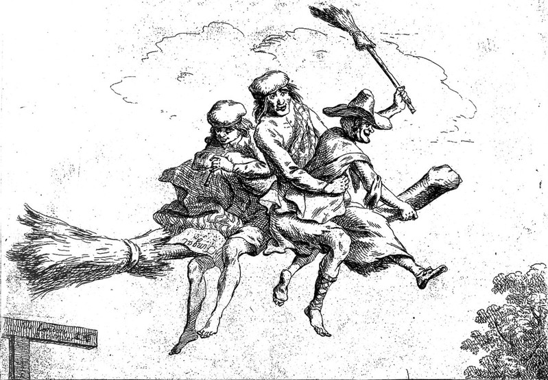 Two Scotsmen and a witch flying on a broomstick.  Etching by P. Sandby.  Courtesy of the Wellcome library.