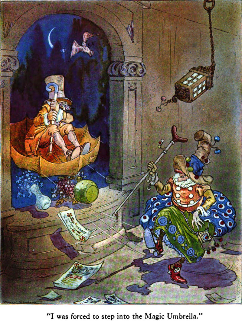"I was forced to step into the Magic Umbrella."  From The Magical Land of Noom, written and illustrated by Johnny Gruelle, 1922.