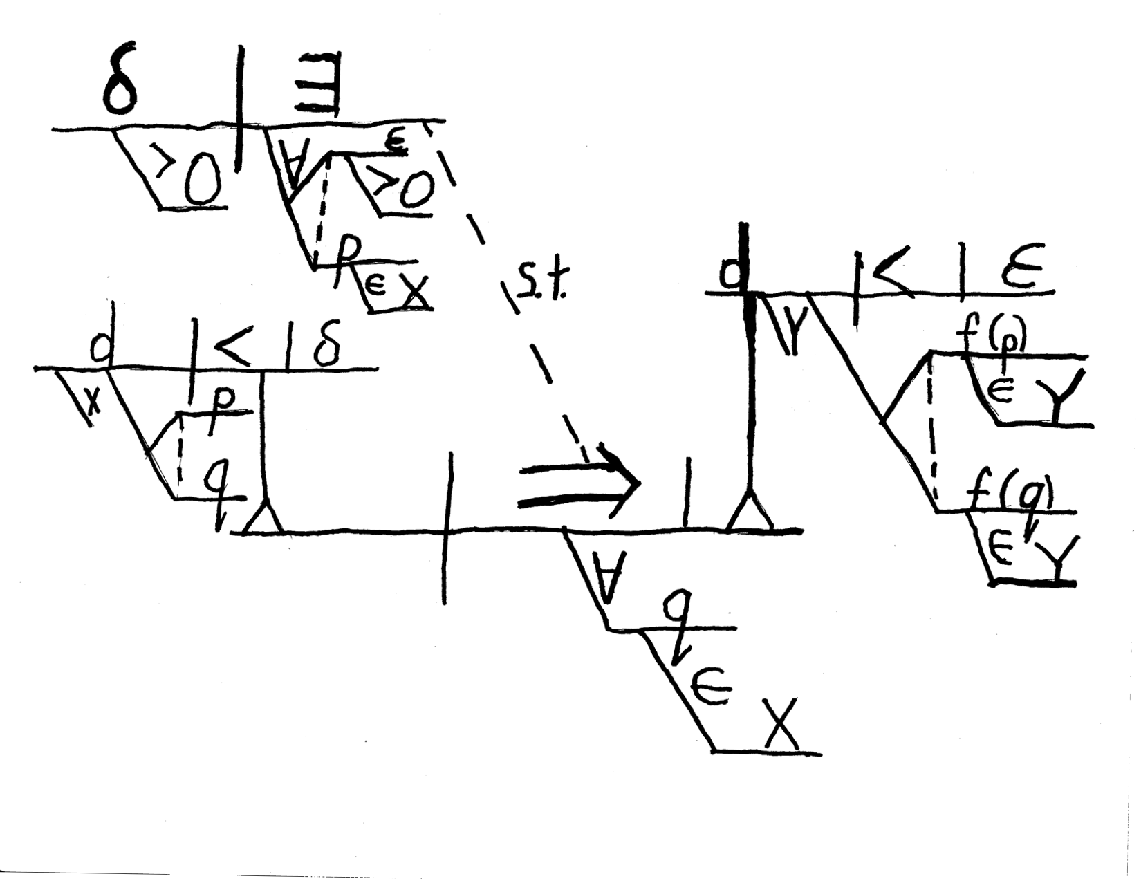 "For all epsilon greater than zero, there exists some delta greater than zero such that, for all points p and q in metric space X, if the distance in X between p and q is less than delta then the distance in Y between f(p) and f(q) is less than epsilon."